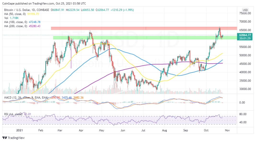 On the other hand, we cannot ignore a sell signal with the Moving Average Convergence Divergence (MACD). Like the RSI, the MACD follows the trend of an asset calculates the momentum. As the 12-day EMA crossed below the 26-day EMA, the odds for a pullback soared. This means that bears could as well regain control and push the price below $60,000 again.