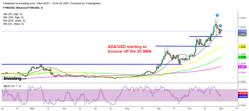 After the first two bullish legs in October which took the price to $3.48, the price retreated lower toward the end of the month, as a result of profit-taking and liquidation of some long positions. But, it seems like the retrace lower might have ended, after the decline stopped just above the previous high, while the 20 SMA was acting as support. yesterday we saw a jump already, but this is still a good time to buy FTM/USD based on this chart.