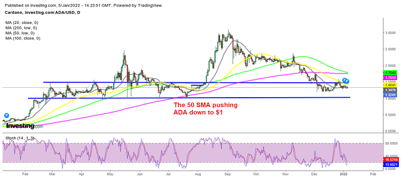 So, ADA/USD has been on a steady decline since September, with moving averages acting as resistance, particularly the 50 daily SMA (yellow). ADA coin fell below $1.50 which used to be resistance and now it seems to be heading for the support level at $1. Although, this whole area is a good zone to build Cardano long positions, hoping that the sentiment in the crypto market will turn bullish soon. If ADA/USD falls to $1, then we would be tempted to open a buy trade so we are following the price action.
