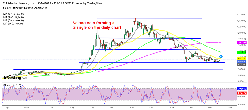 Solana has been declining since early November when it placed a top at $260, falling to $80 during this time, where it has formed a support zone that has been holding since January. The 50 SMA (yellow) is acting as resistance at the top on the other hand, so a triangle is forming on SOL/USD as bounces keep getting smaller.