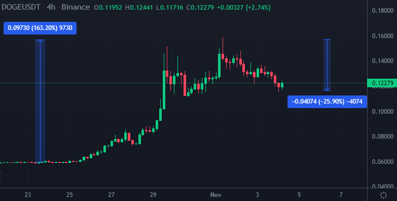 After its over 160% pump since late October, some form of correction was likely – Dogecoin is now down around 25% from its November 1st high of $0.158.