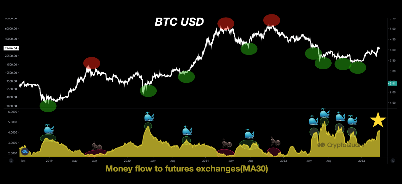 On-chain analysis revealed a high flow of money to futures exchanges. The high flow indicates a period of whale accumulation and the low flow of funds is a period of whale distribution.