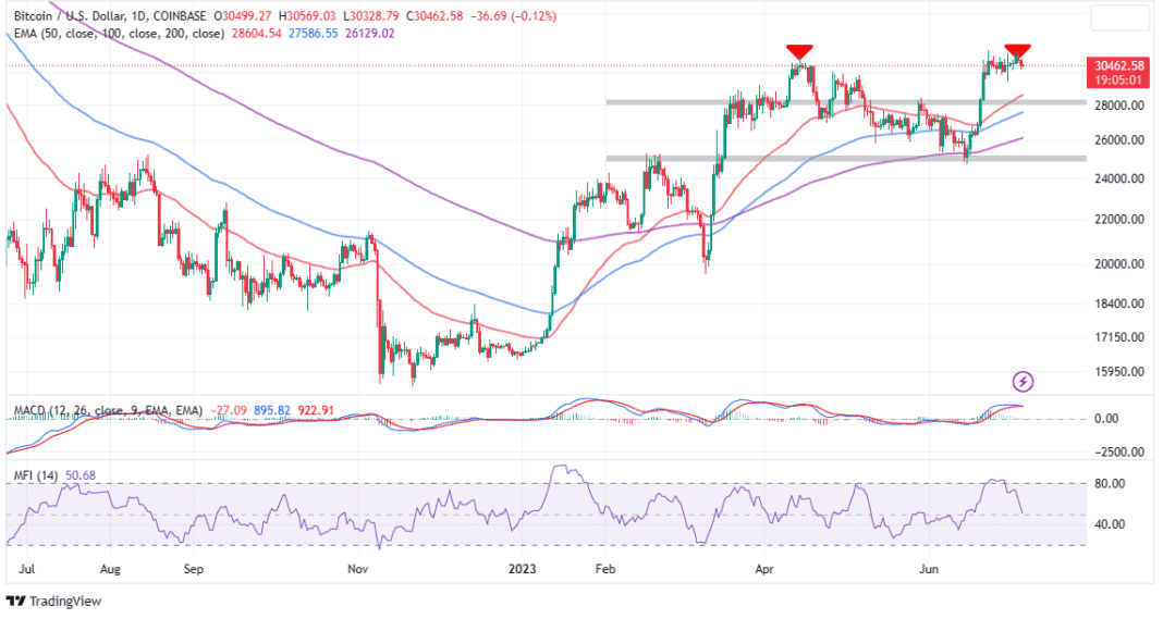 Despite the slight drop, Bitcoin price is comfortably perching above the immediate support at $30,500, with much stronger support expected at $30,000. BTC exploded, reclaiming resistance at $31,000 in June, bolstered by multiple filings by companies wishing to offer a spot Bitcoin ETF.