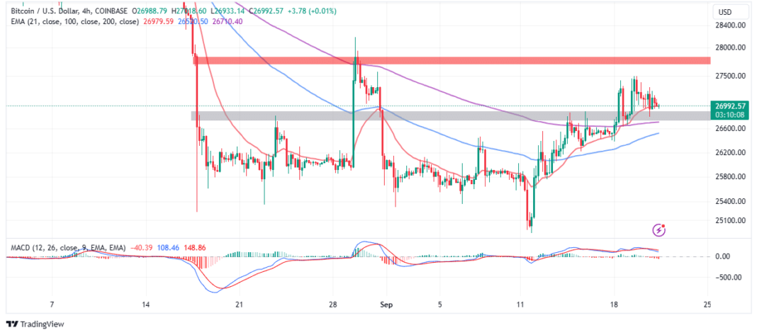 Bitcoin price is struggling to uphold its position at $27,000 support in the wake of the Federal Open Market Committee (FOMC) meeting, which as expected left interest rates unchanged for September.