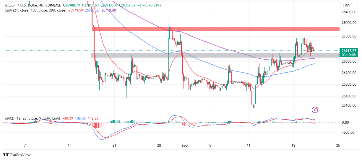 There were no sudden reactions from investors following the announcement as the rate hike pause was expected and already priced in. However, there is evidence of a trendless trading period likely to follow as long as bulls refuse to let go of the $27,000 support.
