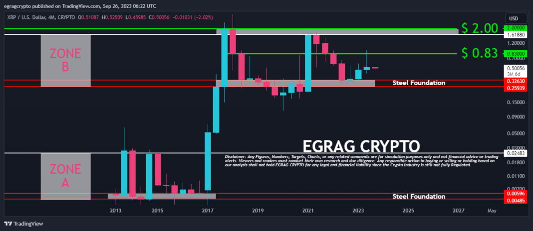 In a recent tweet, renowned crypto analyst, EGRAG CRYPTO, unveiled an intricate 4-month XRP price analysis which presented various crucial insights and predictions. This was encapsulated in his words: “XRP Steel Foundation & Eye-Opening Insights: Behold the chart below, crafted from 4-month candles, revealing that higher time frames are less susceptible to deceptive signals.”