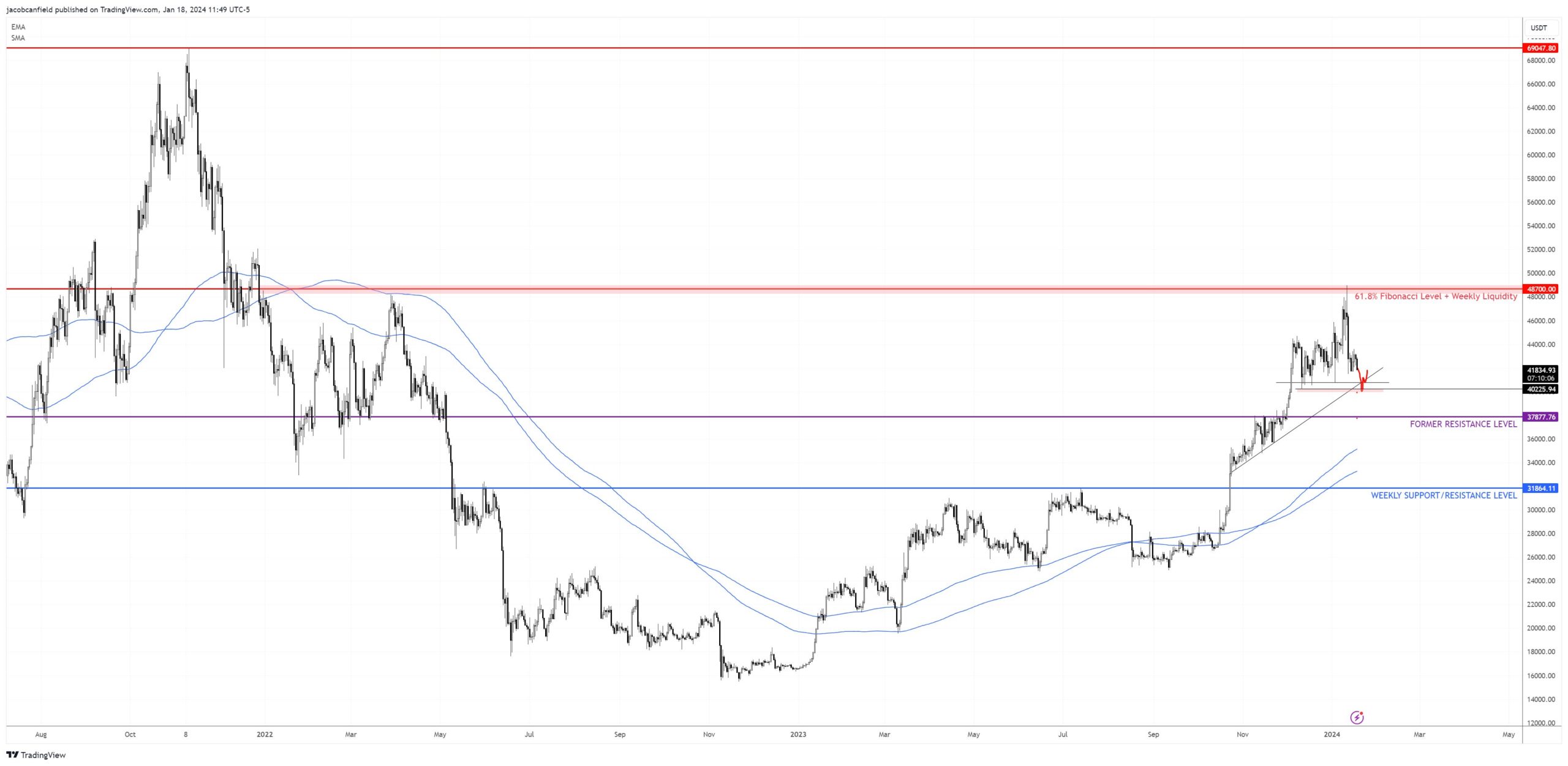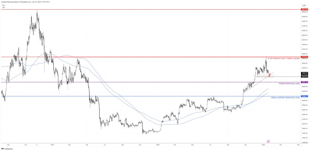 The Bitcoin daily chart presents a narrow path, with significant levels at $48.7k, marked by the 61.8% Fibonacci retracement and weekly resistance, and a notable support level at $38.7k. “As I’ve noticed in former posts, after BTC taps the 61.8, it tends to sell off 18-22%, which would give us another crack at that $38.7k level as well,” warns Canfield.
