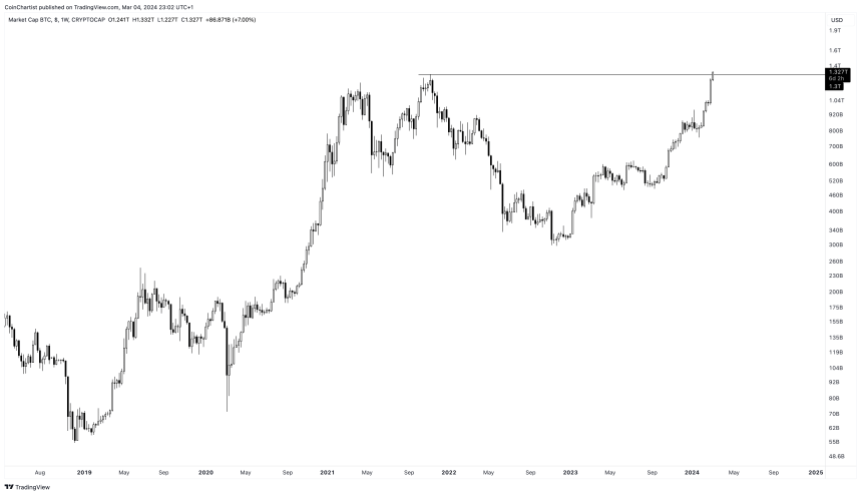 Considering the seemingly unstoppable momentum in Bitcoin price action, a new all-time high on the BTCUSD trading pair is less than 2% away. Meanwhile, due to the supply of new BTC unlocked since 2021, the BTC market cap chart has reached a new all-time high above $1.3 trillion.