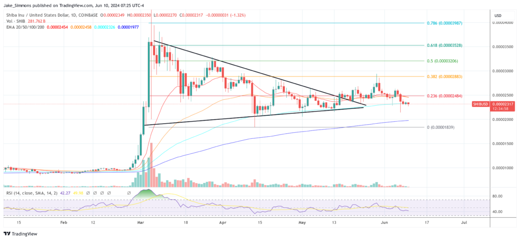 In the daily SHIB/USD chart, Shiba Inu’s price is currently in a consolidation phase, following a significant rally to this year’s high in early March. Despite breaking out of a symmetrical triangle pattern in mid-May, SHIB failed to sustain a close above the 0.382 Fibonacci retracement level of $0.00002883.