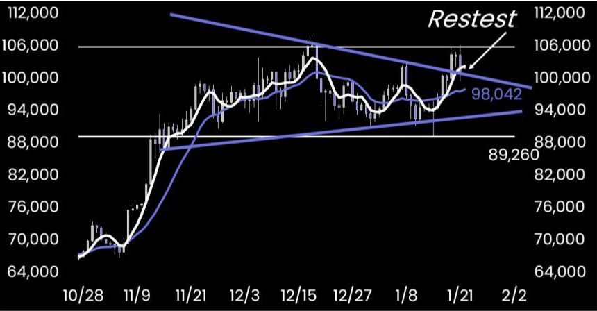 According to Thielen, Trump’s inauguration served as a catalyst for Bitcoin to break out of that wedge, but whether this breakout can hold depends on BTC maintaining support around the upper boundary. “Bitcoin is now retesting the breakout level, which corresponds to the upper boundary of the wedge. If Bitcoin holds above this key support, the short-term outlook remains highly bullish, with the breakout signaling renewed upward momentum,” Thielen writes.