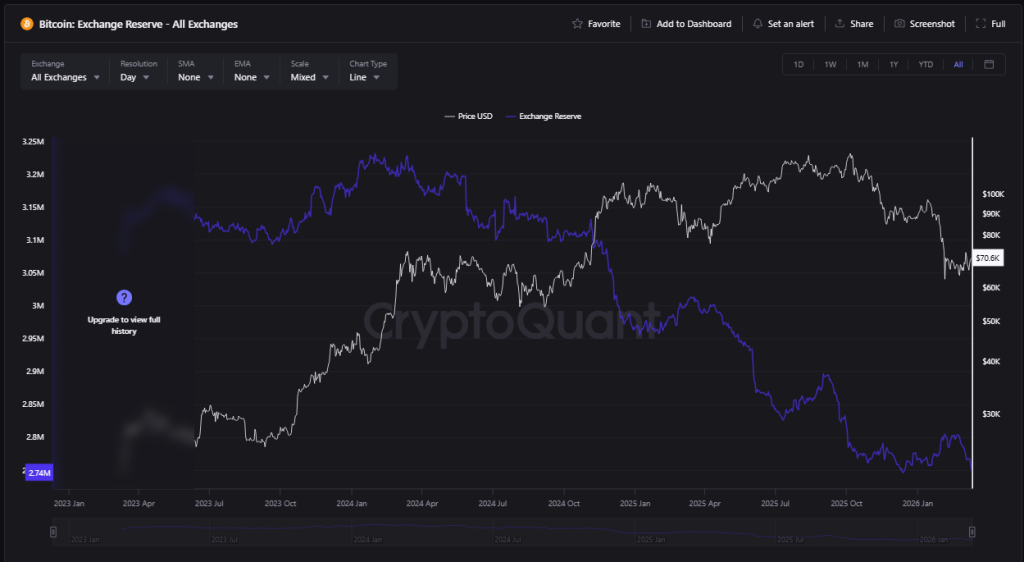 Exchange reserves across all centralized platforms have dropped to approximately 2.75 million BTC as of March 12, according to data from CryptoQuant.